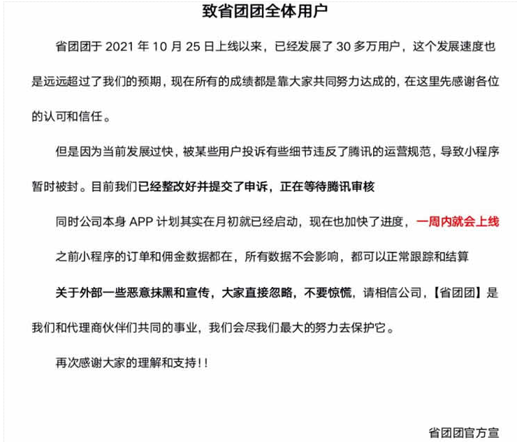 随后,省团团官方公告称:省团团短短2个月就发展了30多万用户,因为发展过快,被某些用户投诉导致被封禁。怀疑原因是根据平台确认收货之后,第二天可以提现的漏洞,出了一只专门薅佣金的团队。目前已经申请提交了申诉,正在等待腾讯审核。关于外部的恶意抹黑和宣传,请大家忽略,不要惊慌。